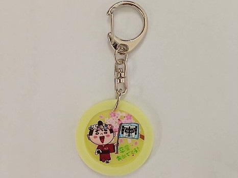 キーホルダーには南中学校のキャラクターがデザインされており、